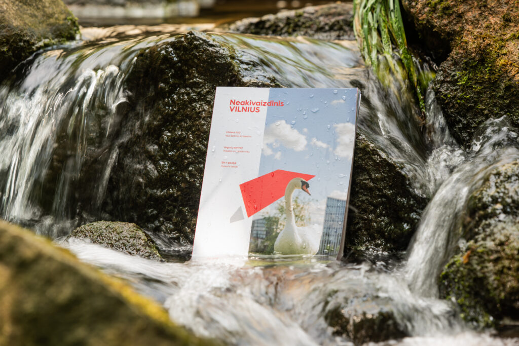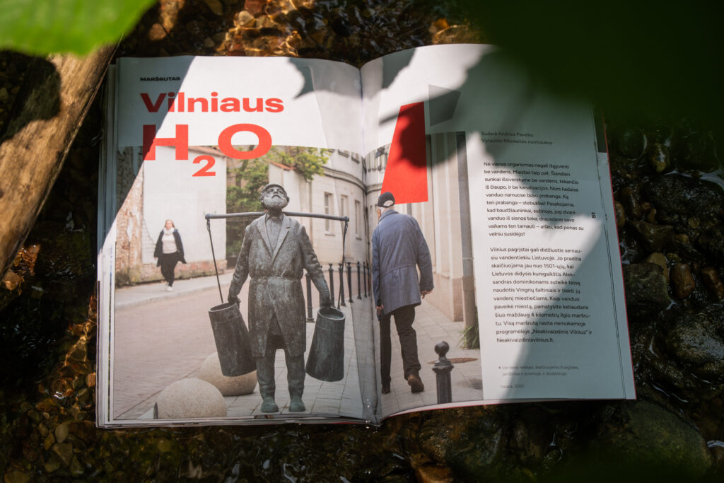 Miesto globėjas šv. Kristoforas brenda per vandenį. Gulbė lipa iš vandens japoniškame sode Šnipiškėse. Atostogautojai šoka ant dviračių ir skaičiuoja gaivinančius miesto šaltinius rubrikoje „Vieta“. Šaltinio fragmentą galima rasti net Filharmonijoje. Darbo voverės ruošiasi į darbą ir galbūt pravažiuoja A. Goštauto gatve palei Nerį. Apie ją, gatvę, pasakojame rubrikoje „Vienos gatvės istorija“. Prieš porą šimtmečių čia virė Lukiškių uosto gyvenimas. Dabar ji – penkių tiltų gatvė.