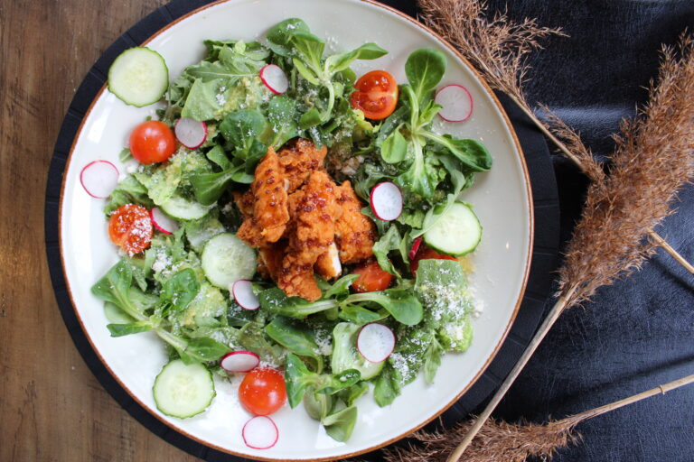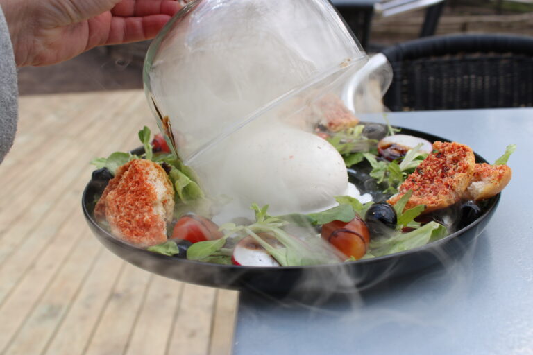 Burrata salad, Crispy cod chunks, homemade lemonade