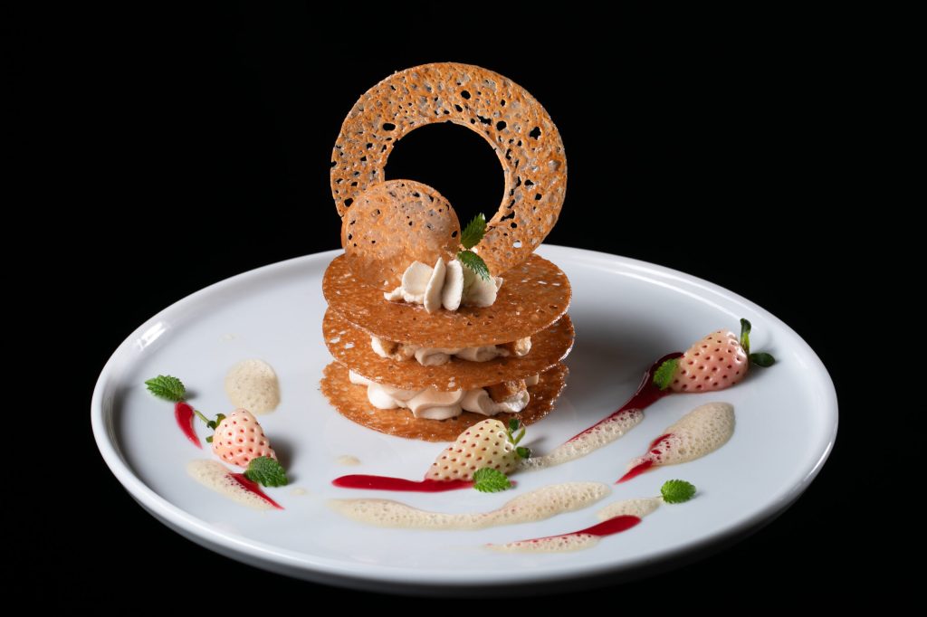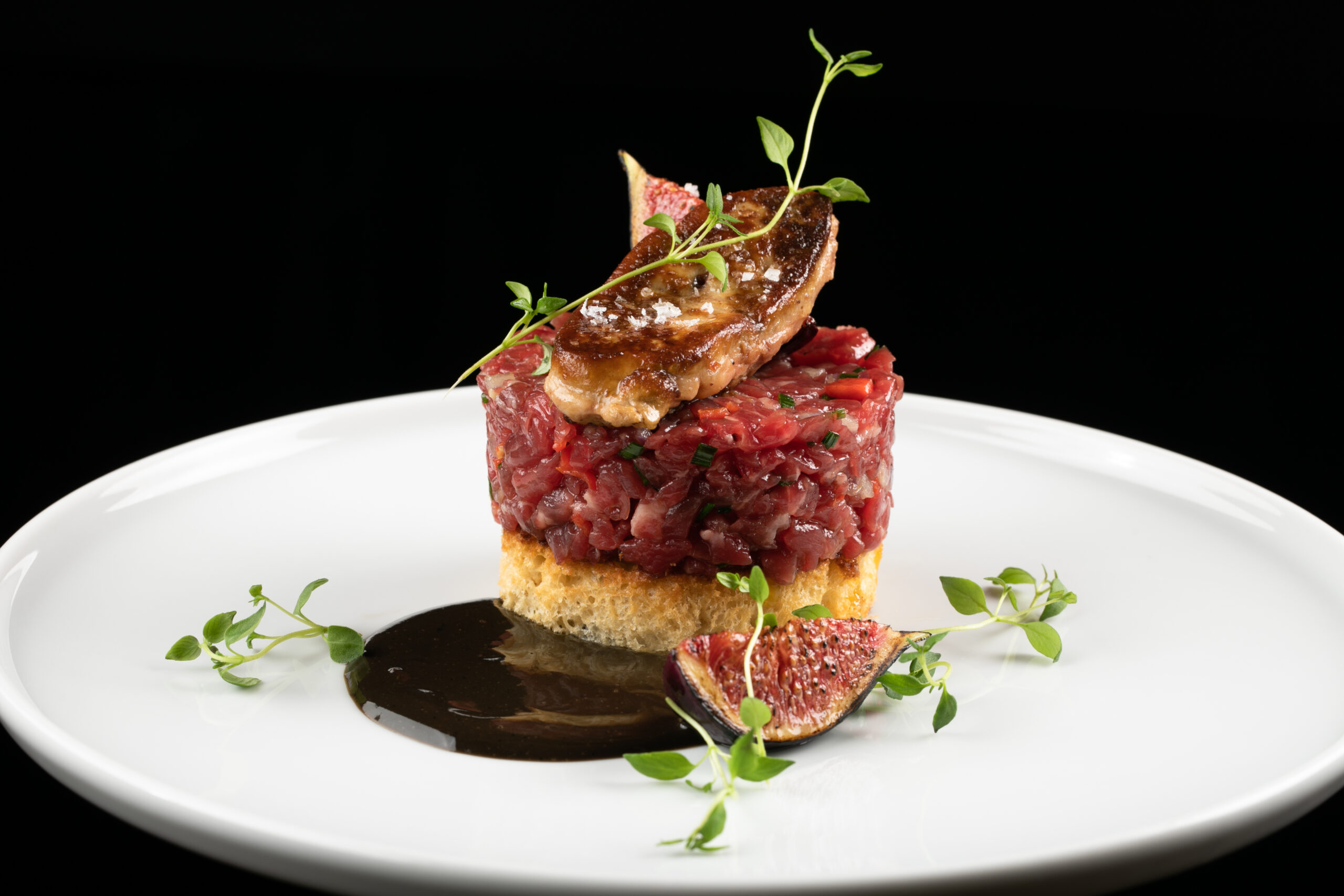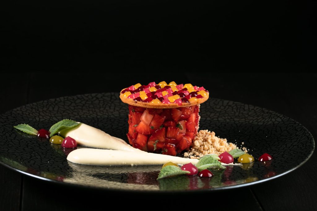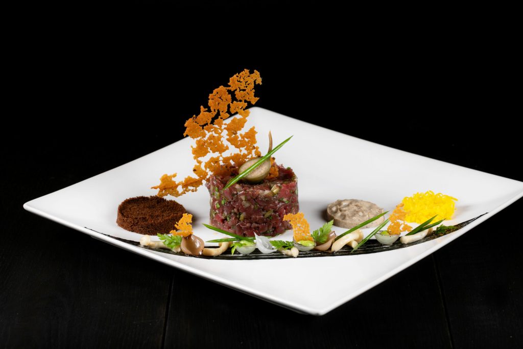 Beef tartare with foie gras, classic tuna tartare, beef tartare with bone marrow, tuna tartare „Gochujang”, oxtail in sugar bone, lamb tenderloin, Mediterranean octopus, „Wellington” steak, passion fruit panna cotta.