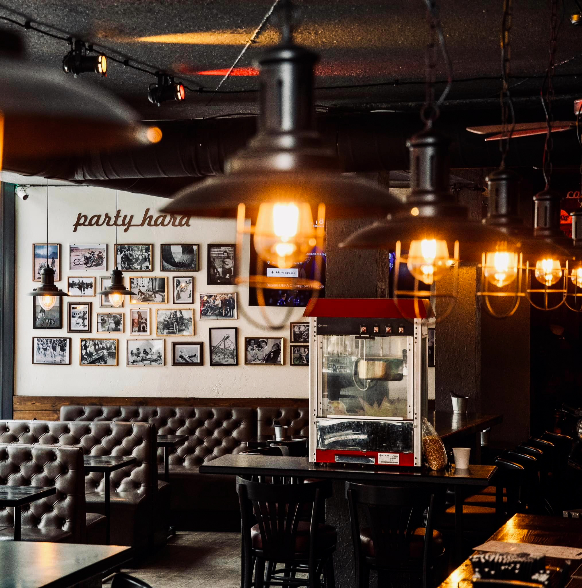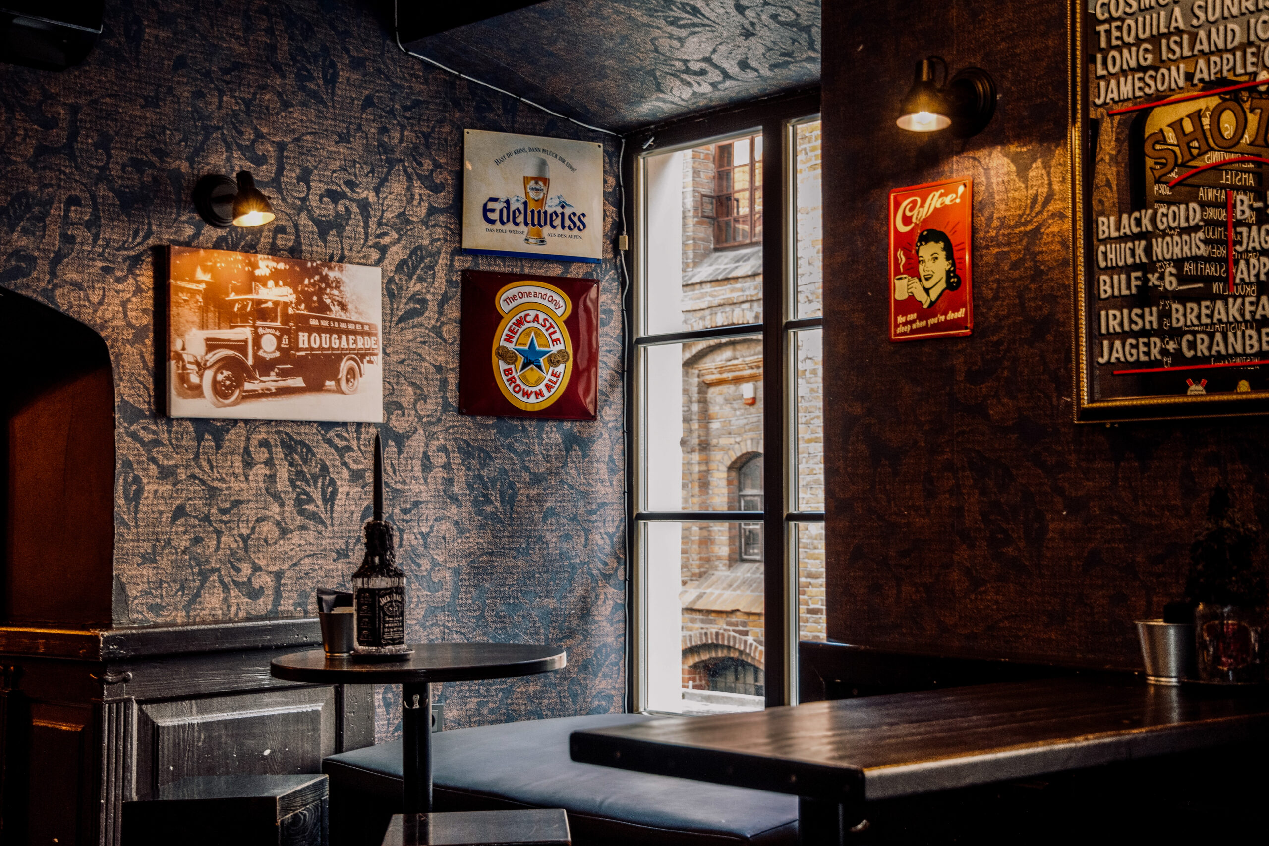 The menu features Anglo-American cuisine — signature Fish & Chips, New York style pizzas, and juicy burgers. Evenings are filled with live music and sports screenings, while the bar walls remind you — celebrate life, cos life is for living.
