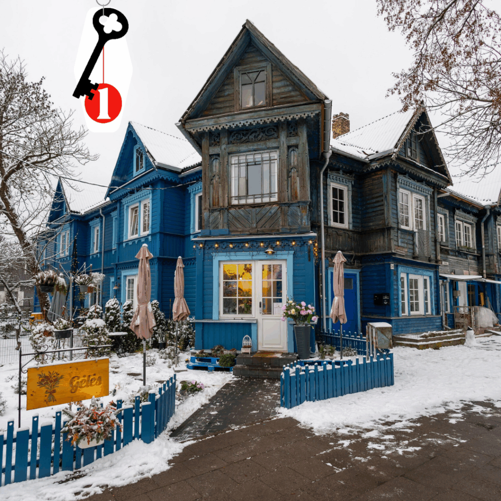 Gatvių sankryžoje įsitaisęs medinukas – pagal garsaus bažnyčių architekto Antono Filipovičiaus-Dubovniko projektą 1901 metais statytas nuomojamų butų namas. Iki šių dienų jis išlaikė žiemiškai mėlyną spalvą ir skardinį stogą. Pažvelgus įdėmiau, matyti tarsi vąšeliu nunerti kalėdiški ornamentai – kiauraraščiai raštai, rombai ir žiedeliai.