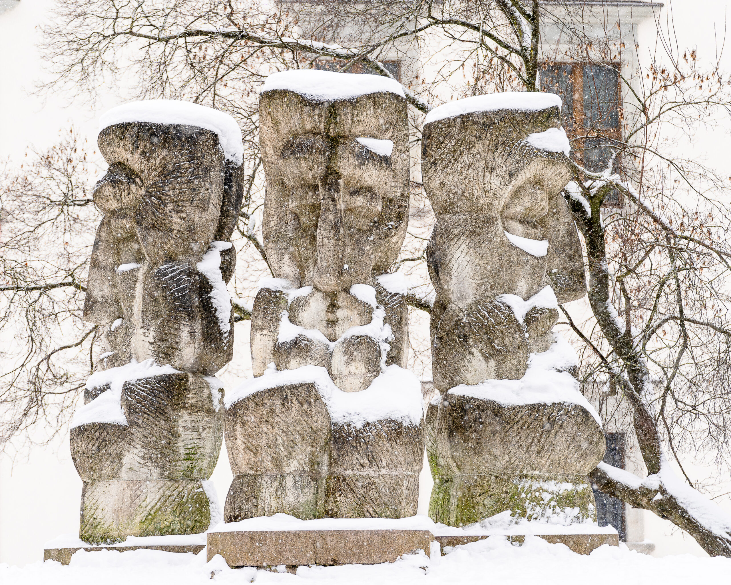 Esu fotografuojanti miesto gidė, mėgstu pagauti akimirkas, kai solidžios skulptūros virsta nežemiškomis formomis. Kaip ir trys Vlado Vildžiūno skulptūros „Lietuviška baladė“ senoliai. Snieguose man jie visad pasirodo jaukiai. Tarsi įsisupę į šiltą pūkinę antklodę nuo savo kalnelio palei Katedrą ramiai neskubriai pasakoja svarbias mums visiems istorijas. Belieka tik įsiklausyti ir išgirsti.