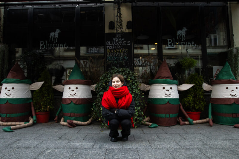 Jeigu atsibodo nuotraukai pozuoti vienam – „pakviesk“ į draugiją šalia Stiklių gatvės vyninės „Vynomanai” rymančią damą. Krūva dovanų vietoj galvos ir raudonos kojos. Tikra šiuolaikinė Kalėdų bobutė.