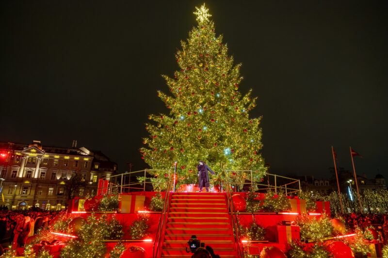 Pati pačiausia, pati svarbiausia, o šiemet – ir pati tikriausia raudono kilimo žvaigždė. Visiems, blyksintiems fotoaparatais bei pozuojantiems asmenukėms, prie Vilniaus eglės yra sumontuota speciali raudona konstrukcija. Skirk pirmąjį kadrą (ar, tiksliau, pirmuosius kadrus) šiai gražuolei, kuri tarsi sukurta pakliūti ant žurnalo apie Vilnių – Europos Kalėdų sostinę 2025 viršelio!